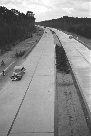 - Die neu eröffnete Reichsautobahn südlich von Frankfurt am Main im Jahre 1935. Auf dieser Strecke Frankfurt-Darmstadt wurden später die Geschwindigkeits-Weltrekorde von Auto-Union und Mercedes erzielt.