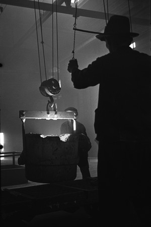 - Metallbank Frankfurt, 2 Arbeiter beim Guß- und Schmelzvorgang im Silumin-Betrieb, 1935