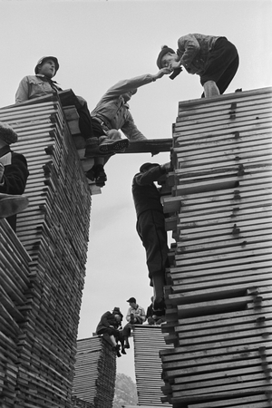 - Winter-Olympiade, Garmisch Partenkirchen, 1936, Helfer auf den Holzstapeln,
