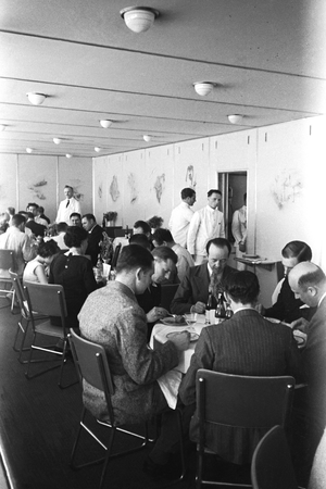 - Zeppelin, Rio-Fahrt mit LZ 129 "Hindenburg", 1936, Passagiere genießen das Essen im Speisesaal über dem Atlantic, Im Hintergrund 3 Stewards, Aufnahme von Alfred Tritschler