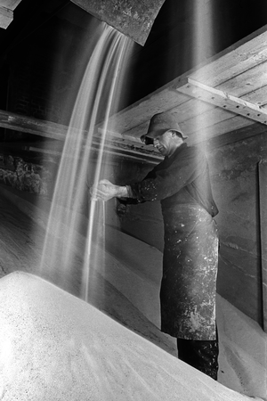 Herzogenrather Glaswerke, 1938, Arbeiter prüft den feinen Quarz, Tafelglasindustrie,