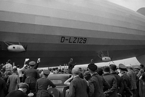 - Max Schmeling , Empfang in Frankfurt, im Hintergrund LZ 129 Hindenburg, 1936
