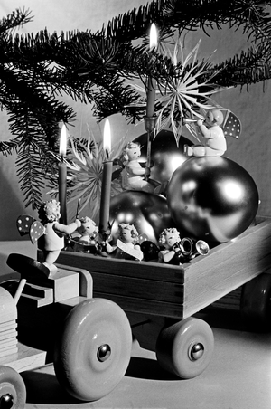 - Weihnachtsmotiv, 1950, Traktor mit Engel, Kugeln, Kerzen und Tannenzweig,