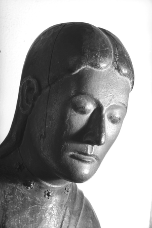 - Mittelalter Skulpturen und Sammlungsstücke aus dem Schnütgen Museum, Kopf des Johannes aus der Sonnenburger Triumphkreuzgruppe, Südtirol, Ende 12. Jahrhundert, Zirbelkiefer, farbig gefasst, Aufnahmen von Alfred Tritschler aus dem Jahr 1948