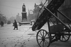 - Offenburg, Winteraufnahme, Dez. 1932, Blick auf die Rückseite des Sir Francis Drake Denkmals (Kartoffelmann), rechts im Vordergrund die Feuerwehrleiter, dahinter das Rathaus und der Königshof,