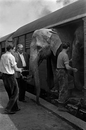 - Zirkus Barum, 1952, Elefanten werden aus dem Sonderzug am Güterbahnhof entladen,