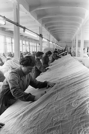 - Trier, Deutsche Bobinet, Textilindustrie, Durchsicht der fertigen Stoffe, 1958