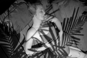 Fotomodell liegt auf den Holzplanken und der Schatten der Palme bedeckt ihren Körper,