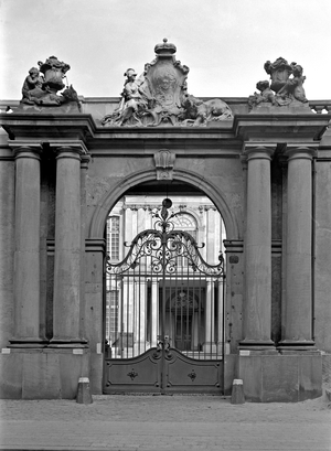 - Frankfurt, Palais Thurn und Taxis, Eingangsportal mit Wappen an der Großen Eschenheim Gasse, 1944 beschädigt und 1951 vereinfacht wieder aufgebaut, Aufnahme von 1932,