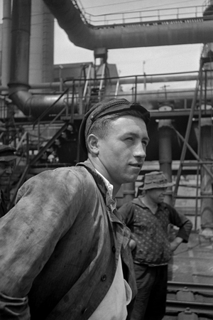 Völklingen, Röchling-Hütte, 2 Stahlarbeiter, im Hintergrund Werksanlagen, wie Bild Nr.: 964-039, 1934