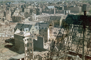 Frankfurt, zerstört, Farbdia, Blick vom Dom zur Battonstraße, Im Vordergrund ist zu sehen, was von Hainerhof und Fahrgasse übrig blieb, nach dem Luftangriff vom März 1944,