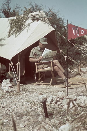 - 2. Weltkrieg, Afrikafeldzug, Gefechtsstand, Soldat mit Zeitung vor dem Zelt,
