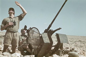 - 2. Weltkrieg, Afrikafeldzug, Dt. Beobachtungsstand mit 2 cm Geschütz und 2 Soldaten in der Wüste