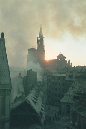 - Straßburg, Blick auf das Münster, Sonnenaufgang im Winter 1944, Aufnahme von Paul Wolff