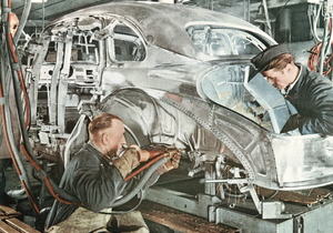 - Farb-Foto, Opel-Buch, 1939, Opel Kapitän - Fertigung, 2 Arbeiter am Fließband,