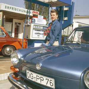 - Farb-Dia, Aral-Tankstelle, Thomas Sommer beim Tanken vom VW 1600, Aufnahme von Robert Sommer, 1974