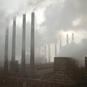 - Farb-Dia, Industrielandschaft im Ruhrgebiet mit rauchenden Schornsteinen, 1960,