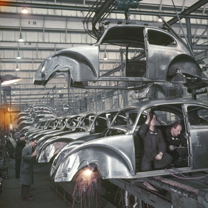 - Farb-Dia, VW-Käfer Produktion, Am Fließband, Arbeiter bei Schweißarbeiten,