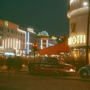 - Farb-Dia, Berlin, Straßenverkehr bei Nacht mit Sarotti Werbung, 1958