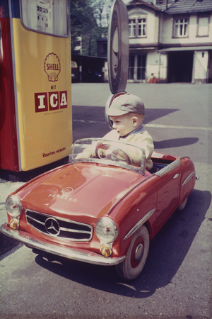 - Thomas Sommer an der Shell-Tankstelle in Frankfurt/Main, Friedrichstraße mit seinem Tretauto "FERBEDO" Mercedes Benz 190 SL, 1957