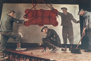 - Herzogenrather Glaswerke, 1938, Wenn eine Seite geschliffen und poliert ist, muß die kostbare Kristallspiegelglasplatte mit Hilfe von Gummisaugfüßen gewendet werden. Farbaufnahme gleich, wie s/w-Aufnahme Nr.: 2030-005