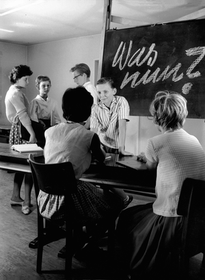 - Schüler im Klassenzimmer, An der Tafel steht: "Was nun?", kein Negativ mehr vorhanden, 1958