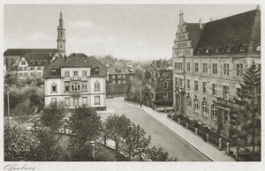 Offenburg, Historische Postkarte, rechts Gebäude der Vorschusskasse, im Hintergrund die Kreuzkirche, 1910