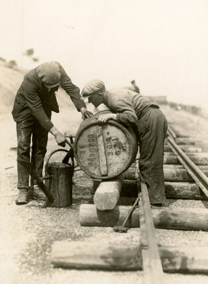 - Nürburgring, Platten-Negativ im Krieg zerstört, Vintage-Print im Archiv vorhanden. Frühe Aufnahme von Paul Wolff, 1925, Arbeiter füllen Magnon in eine Kanne. Die Straßen auf dem Ring erhielten unterschiedliche Oberflächen, so wurde ab Kilometer 13 die Teersuspension Magnon genutzt.