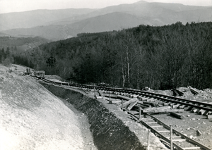 - Nürburgring, Platten-Negativ im Krieg zerstört, Vintage-Print im Archiv vorhanden. Frühe Aufnahme von Paul Wolff, 1925, Hinter der Poststraßen-Brücke führt die Strecke in Richtung Fuchsröhre. Mit der Lorenbahn werden gerade Holzstämme für den weiteren Gleisausbau transportiert. Im Bildhintergrund ist die Hohe Acht zu erkennen.