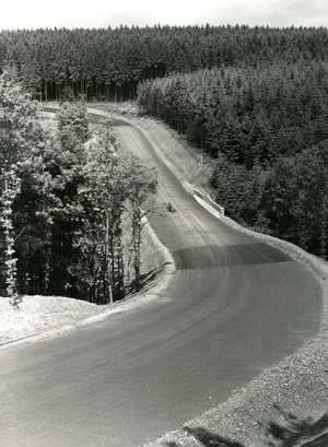 - Nürburgring, Platten-Negativ im Krieg zerstört, Vintage-Print im Archiv vorhanden. Frühe Aufnahme von Paul Wolff, 1925, Der Streckenabschnitt Brünnchen nach der Fertigstellung. Noch stehen die Bäume dicht an der Strecke.