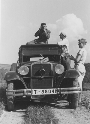 - Paul Wolff beim Fotografieren auf dem Mercedes-Autodach. Der Mann mit weißer Kopfbedeckung ist Alfred Tritschler, 1936