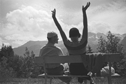 | ARCHIUM_PROPERTY_content_general | Italienfahrt, Paar auf der Bank mit Blick auf die Berge. Die Frau streckt die Arme in die Höhe, 1934 |