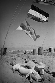 | ARCHIUM_PROPERTY_content_general | Norderney, 1935, Ehepaar liegt in der Strandburg, Fahnen wehen darüber, |