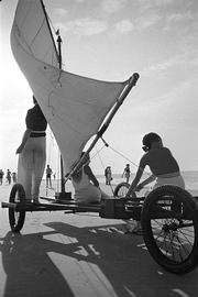| ARCHIUM_PROPERTY_content_general | Juist, 1935, drei Frauen am Strand mit dem Segelwagen, |