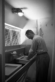 | ARCHIUM_PROPERTY_content_general | Zeppelin, Rio-Fahrt mit LZ 129 "Hindenburg", 1936, Fluggast im Badezimmer, Aufnahme von Alfred Tritschler |