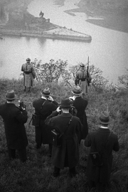 Fotografen dokumentieren den Blick mit den letzten französischen Soldaten im Vordergrund. |