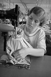 | ARCHIUM_PROPERTY_content_general | Bierbaum-Proenen, Köln, 1937, Textilunternehmen, Herstellung von Kleidungsstücken, Arbeiterin an einer Spezialmaschine für das Nähen der Seitennaht am Proenen-Hemd, |