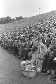 | ARCHIUM_PROPERTY_content_general | Frankfurt, Fußballstadion, 1948, Brezel-Verkäufer am Spielfeldrand, |