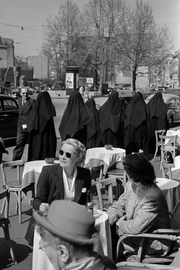 | ARCHIUM_PROPERTY_content_general | Köln, zwei Frauen im Straßen-Kaffee der Innenstadt, dahinter läuft eine Gruppe von Nonnen vorbei, 1948 |