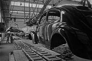 | ARCHIUM_PROPERTY_content_general | Volkswagenwerk, Wolfsburg, VW-Käfer-Produktion, Karosserien auf dem Transportband und in der Luft, 1949 |