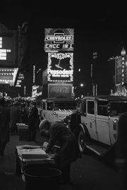 | ARCHIUM_PROPERTY_content_general | New York, Nachtaufnahme, Zeitungsverkäufer auf der Straße, im Hintergrund leuchtende Werbung: "Pepsodent", 1932 |