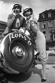 | ARCHIUM_PROPERTY_content_general | Röhr Auto AG, Ober-Ramstadt, 1933, 2 Damen über dem Reserverad von einer Röhr 8 Limousine, |