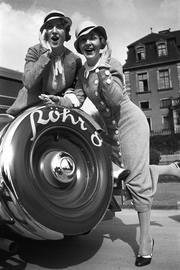 | ARCHIUM_PROPERTY_content_general | Röhr Auto AG, Ober-Ramstadt, 1933, 2 Damen über dem Reserverad von einer Röhr 8 Limousine |