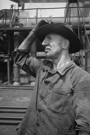 | ARCHIUM_PROPERTY_content_general | Völklingen, Röchling-Hütte, Stahlarbeiter, rechter Arm am Hut, im Hintergrund Werksanlagen, 1934 |