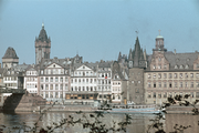 | ARCHIUM_PROPERTY_content_general | Frankfurt, unzerstört, Farbdia, Mainfront vom Sachsenhäuser Ufer aus aufgenommen, links überragen die beiden Rathaustürme der "Kleine Cohn" und der "Lange Franz" die Häuserzeile, rechts der spätgotische Rententurm - im Hintergrund die Turmspitze der Paulskirche, |