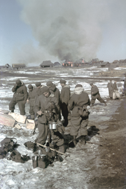 | ARCHIUM_PROPERTY_content_general | 2. Weltkrieg, Russland, Deutsche Soldaten vor einem brennenden Dorf im Mittelabschnitt, 1943/44 |
