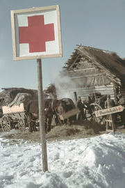 | ARCHIUM_PROPERTY_content_general | 2. Weltkrieg, Russland, Deutscher Truppen-Verbandsplatz mit Pferdewagen und Soldaten, 1943/44 |