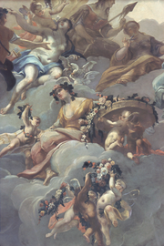 | ARCHIUM_PROPERTY_content_general | Frankfurt, Palais Thurn und Taxis. Ausschnitt aus dem Deckengemälde des Kuppelsaales im Palais Thurn und Taxis, links oben Venus, daneben die Parzen, darunter Flora mit den Kindern des Frühlings. Gemälde von Luca Antonio Colomba, 1734-35. Diese Farbaufnahmen hat Dr. Paul Wolff auf Anordnung des Propagandaministeriums 1943 angefertigt. Für diese Aufnahmen wurde extra ein Gerüst aufgebaut und auf diesen schwankenden Brettern, 14 Meter über dem Fußboden, sind diese einmaligen Aufnahmen entstanden. |