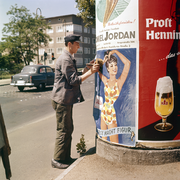 | ARCHIUM_PROPERTY_content_general | Frankfurt, Bekleben einer Litfaßsäule, "Prost Henninger" - Bierreklame, 1960 |