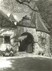 | ARCHIUM_PROPERTY_content_general | Rothenburg ob der Tauber. Das Burgtor mit den beiden Tortürmchen wurde um 1460 erbaut und gehört zu der westlichen Toranlage der Stadtbefestigung. Paul Wolff hat diese berühmte Aufnahme mit den beiden Frauen auf der Steinbank, im Frühjahr 1925 mit seiner Platten-Kamera (Glasplatten-Negativ-Format 18 x 24 cm) im Auftrag der Deutschen Reichsbahn-Gesellschaft, Reichsbahndirektion Karlsruhe, gemacht. Die Archiv-Nr. lautet: 1090. |
